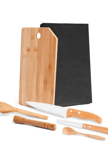Kit para pizza em bambu. Composto por uma tábua redonda com Ø 35cm, porta-guardanapos e uma espátula em bambu de 26cm em bambu; cortador de pizza com cabo em bambu/inox e um jogo de quatro taças de 300ml, acomodados em uma caixa kraft com tampa (ideal para cervejas do tipo premium ou diferentes drinks).