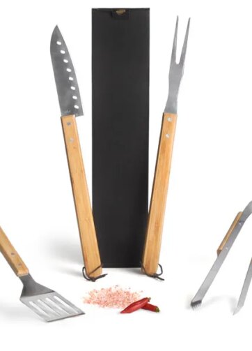 Acompanha tábua com três furos em bambu; faca 7” e garfo trinchante em bambu/inox; duas taças de cerveja em vidro e espaço para garrafa com palha (NÃO ACOMPANHA GARRAFA).