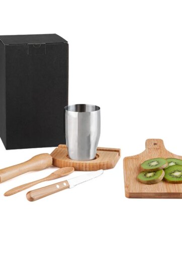 Kit para pizza em bambu. Composto por uma tábua redonda com Ø 35cm, porta-guardanapos e uma espátula em bambu de 26cm em bambu; cortador de pizza com cabo em bambu/inox e um jogo de quatro taças de 300ml, acomodados em uma caixa kraft com tampa (ideal para cervejas do tipo premium ou diferentes drinks).