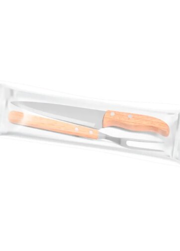 Conjunto em bambu/madeira/aço inox. Acompanha faca e garfo para churrasco, pegador e espátula perfurada em madeira/inox.